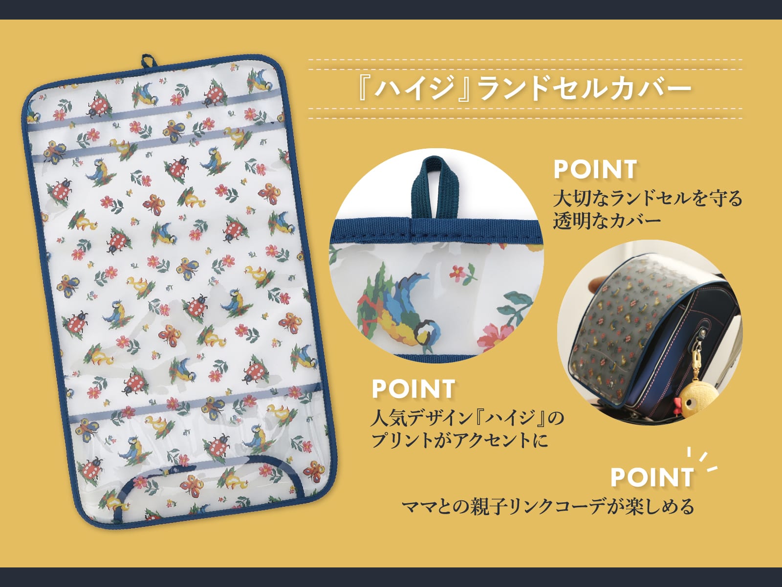ランドセルにかぶせる透明なカバーです。ランドセルのかぶせの内側のプリントとリンクしたフェイラーの人気デザイン『ハイジ』をプリントしました。