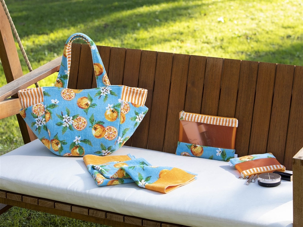 清涼感あふれるターコイズブルーベースに、フレッシュなオレンジをちりばめた「ネロリ」。大きめのトートバッグは、元気がみなぎってくるようなビタミンカラーのコントラストにストライプ柄が映えて、夏のバカンス気分を盛り上げてくれます。軽快なシュニール織でたっぷりと入り、開け口がファスナー付きなのも安心。両サイドにはポケット付きで、必需品もさっと取り出せます。さらに内側にもオープンポケットとファスナーポケットを備え、機能性も優秀。大小サイズのメッシュポーチやタオルなど、豊富なラインアップも魅力です。ぜひバッグとお揃いでご愛用ください。