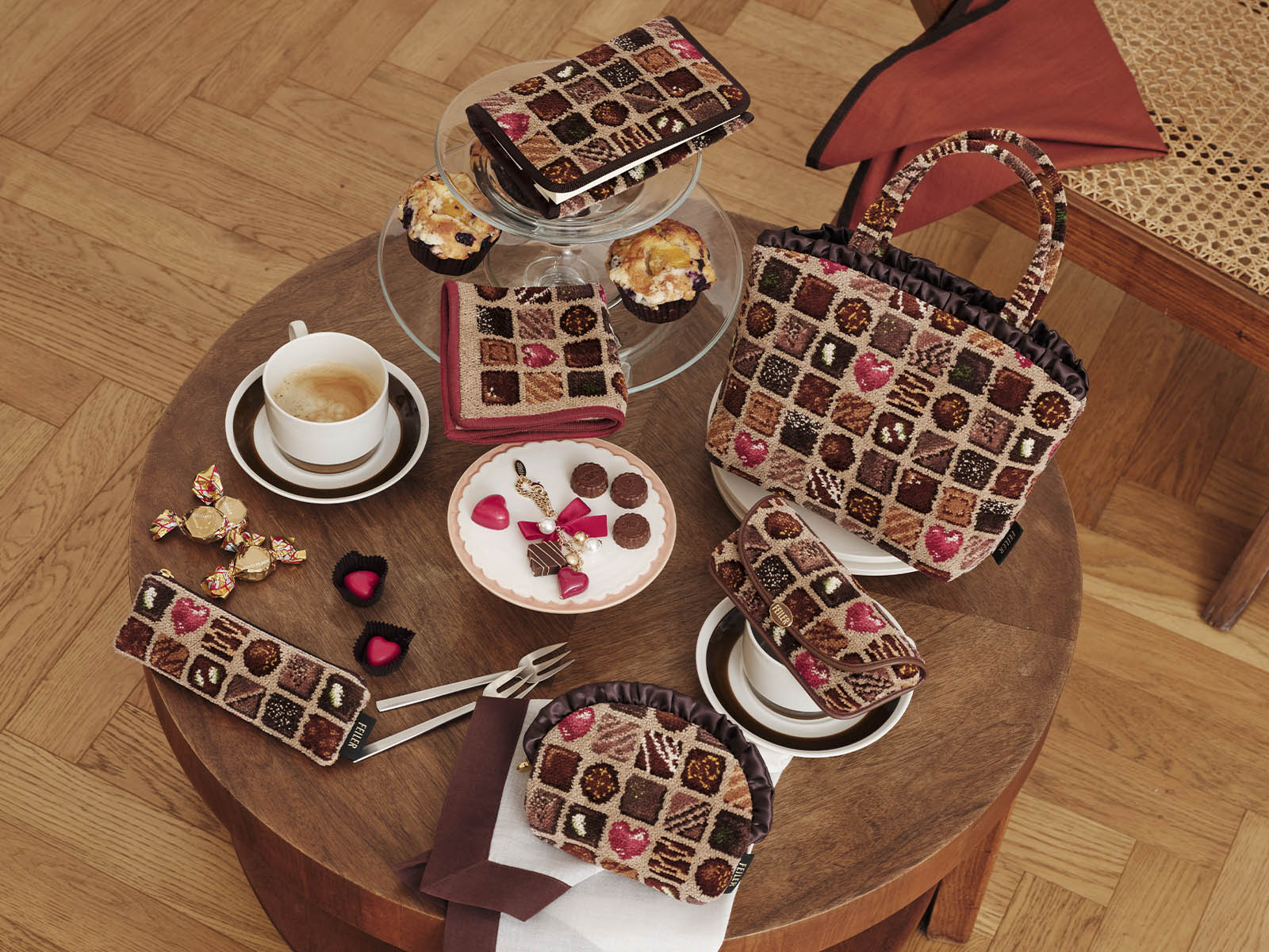 『コフレドゥショコラ』ハンカチ 約25×25cm(ベージュ×ダークレッド) ¥2,750(税込)