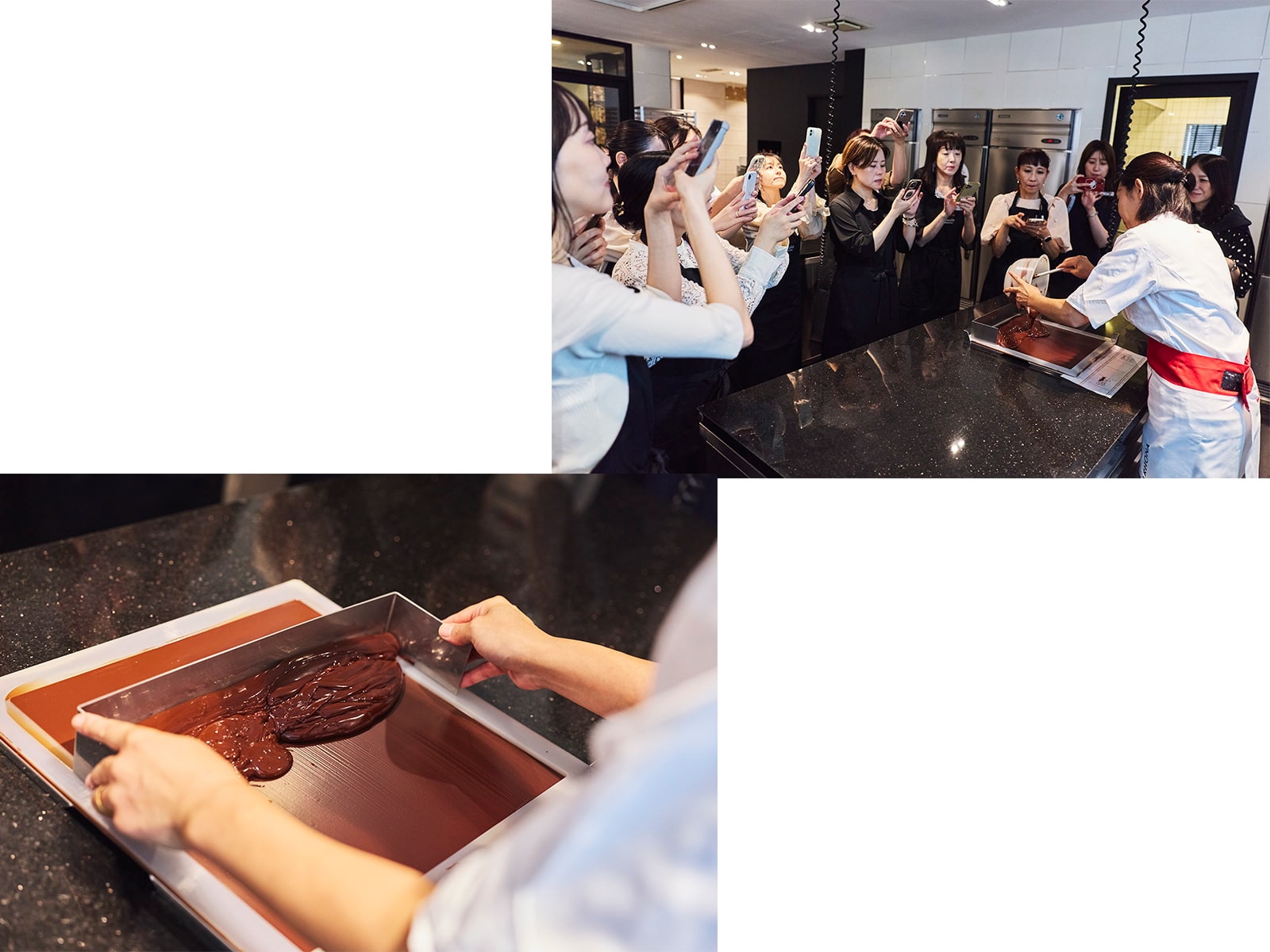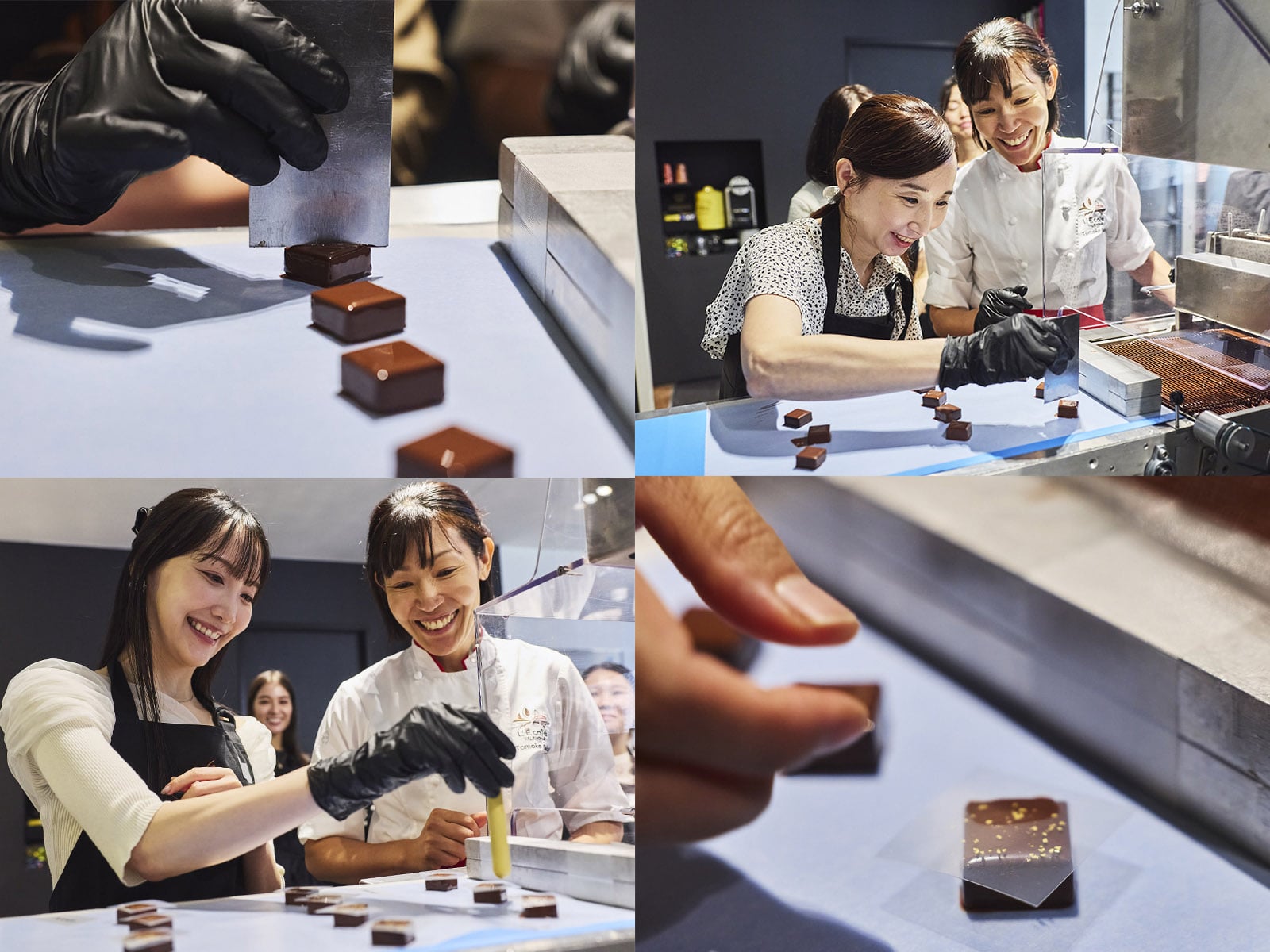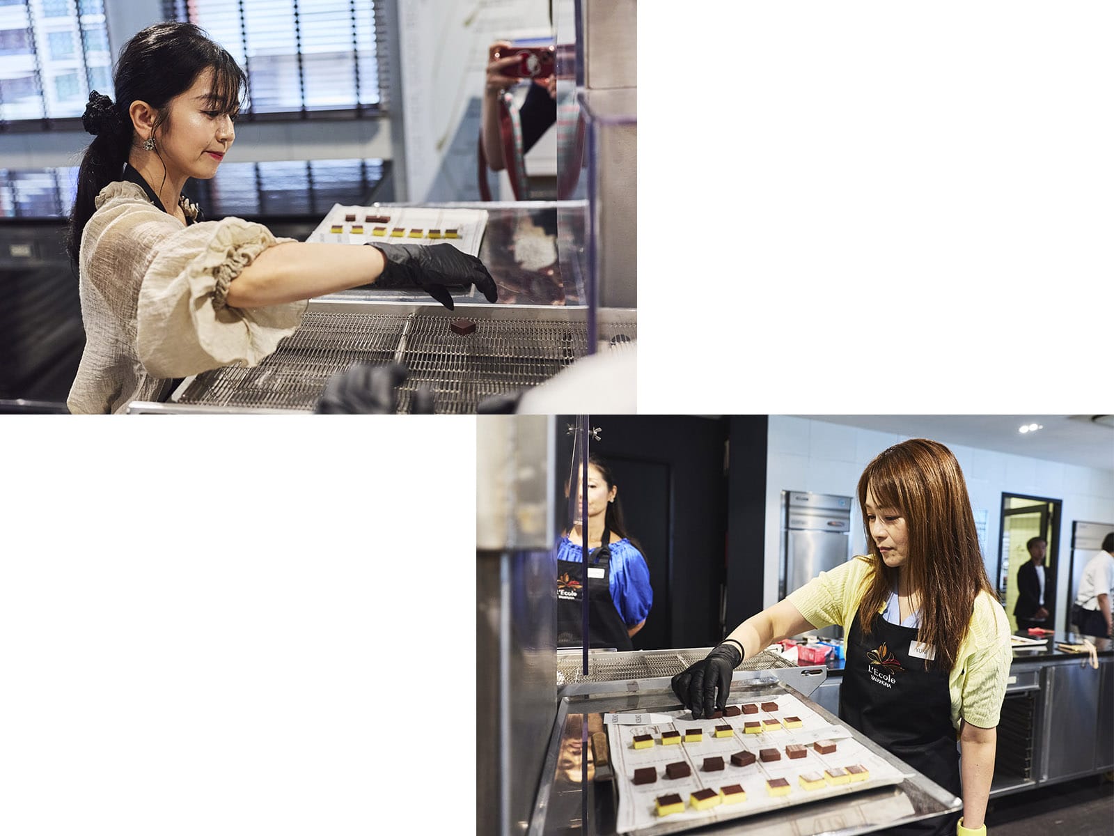一度は耳にしたことのあるテンパリング(チョコレートに含まれるココアバターの結晶を安定化させるための温度調整作業)など、徹底した温度管理のもとで行われる繊細かつ丁寧な作業とテクニックの数々にため息がもれました。