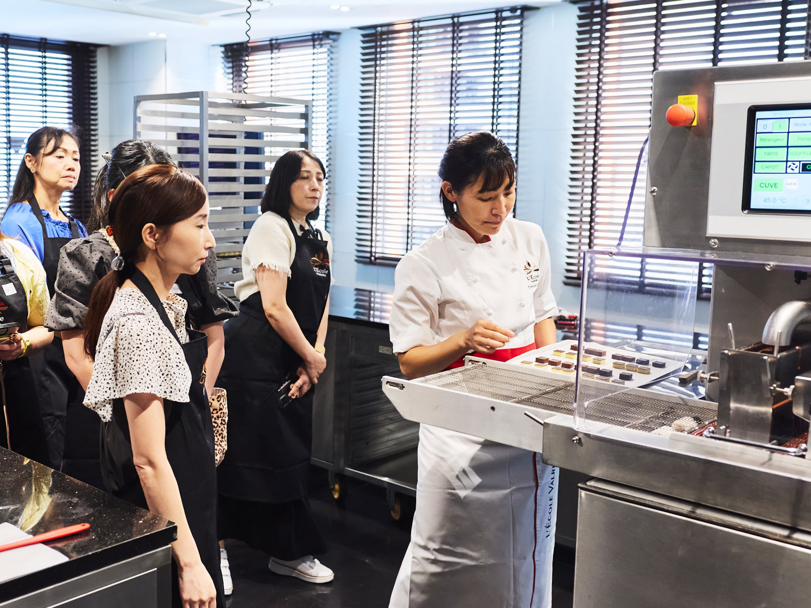 今回のワークショップは、ヴァローナ社のショコラ専門技術校であるエコール・ヴァローナ 東京のシェフパティシエ 境 智子さんに講師を務めていただき、カカオの香り漂う本格的なラボラトリーで開催。繊細なボンボンショコラの製作はチョコレートのなかでも最高峰レベルといわれ、通常のクラスは3日間かけて行われるそうですが、今回はぎゅっと3時間に凝縮して、プロフェッショナルな世界を垣間見せていただきました。