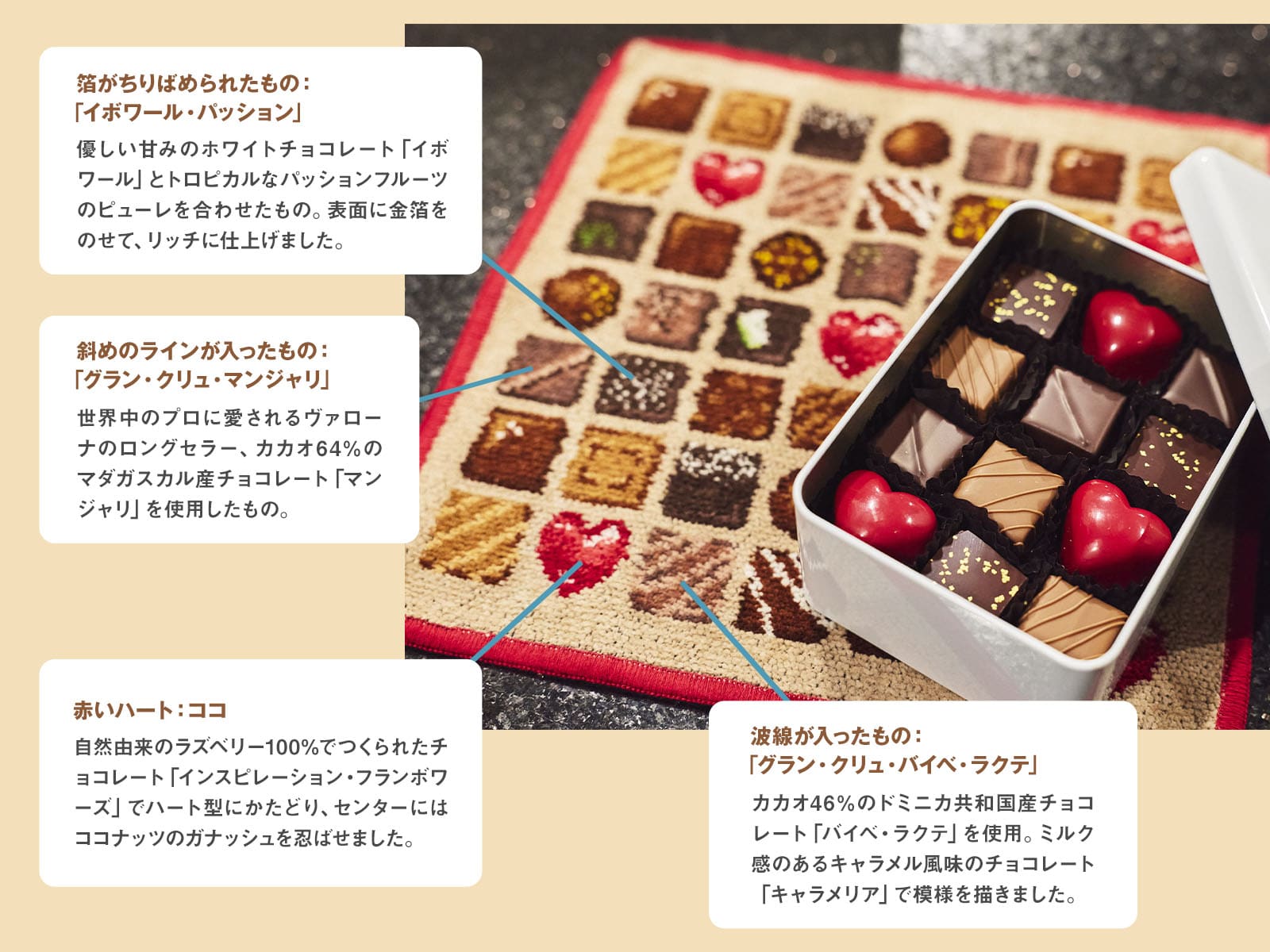 ひときわ目を引く赤いハートのショコラをはじめ、1粒1粒、色や形、デコレーションにこだわり、味わいまで考えてデザインされています。