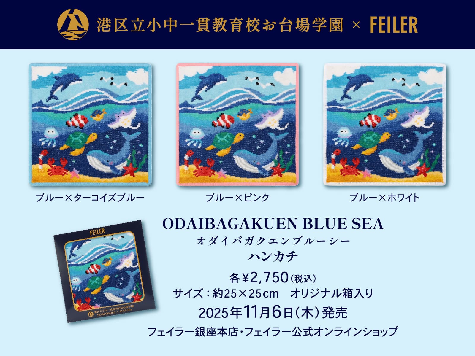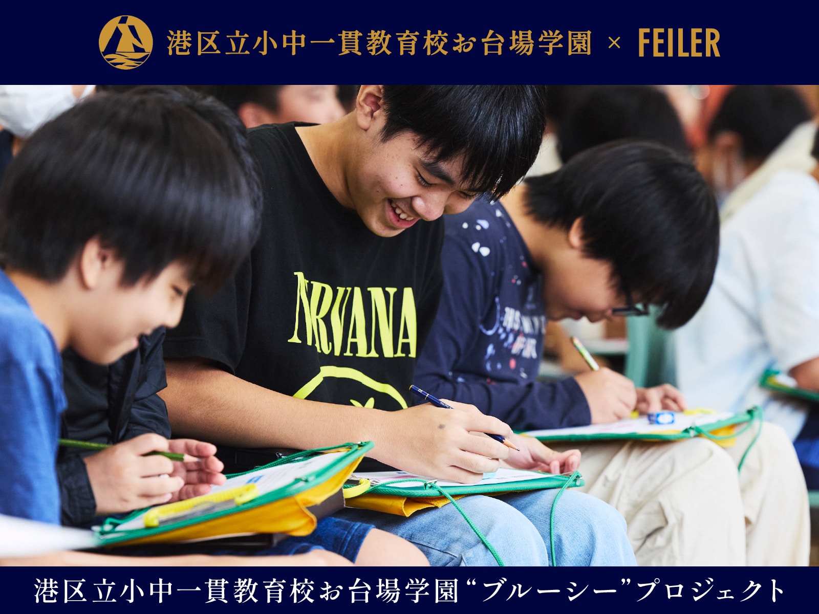 お台場の海のすぐそばに位置する港区立小中一貫教育校お台場学園の海に関する学習や特色ある学習をとおして子ども達が得た「海の環境を守る大切さ」を発信したい、という想いに共感し、小学6年生と共創し、「FEILER(フェイラー)」のハンカチをとおして「海の環境を守る大切さ」を発信する“ブルーシー”プロジェクトを実施いたしました。