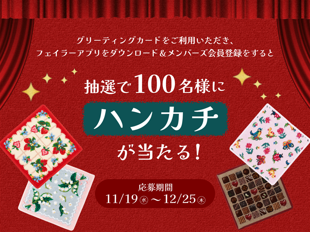 さらに、デジタルグリーティングカードをご利用いただきました方に、フェイラーアプリダウンロードとメンバーズ会員登録で、抽選で100名様にハンカチが当たるキャンペーンも実施いたします。