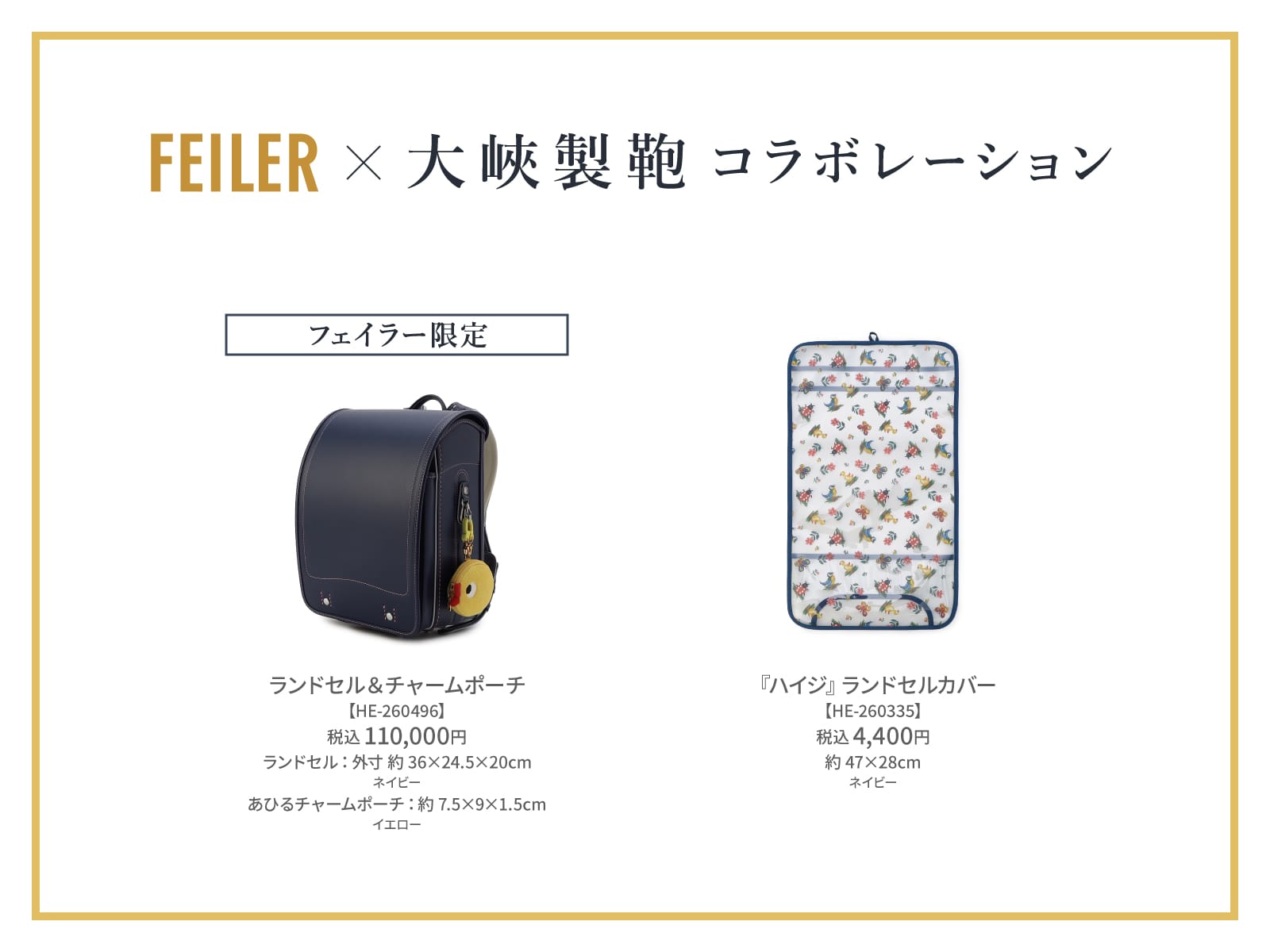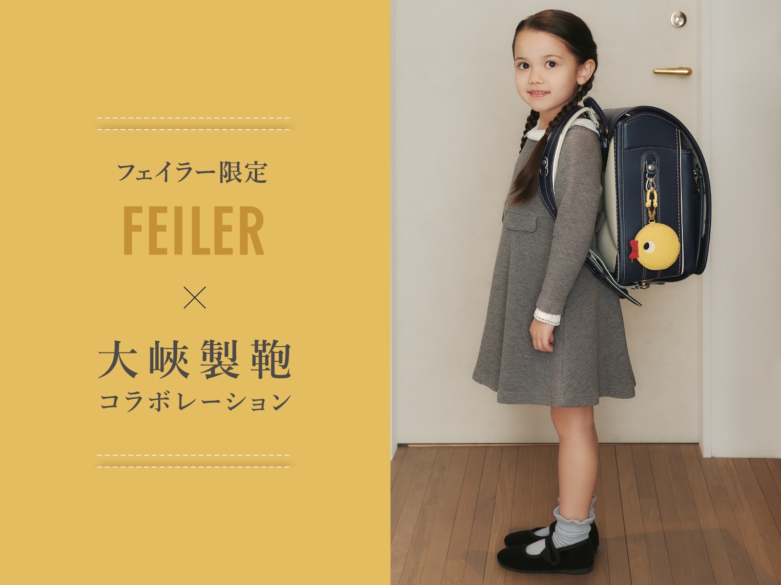 2026年5月に、1935年創業のランドセルのトップメーカー「大峽製鞄株式会社」とのコラボレーションランドセル(ネイビー)&チャームポーチをフェイラー限定にて発売、そして、ランドセルとリンクしたランドセルカバーを発売することを発表いたします。