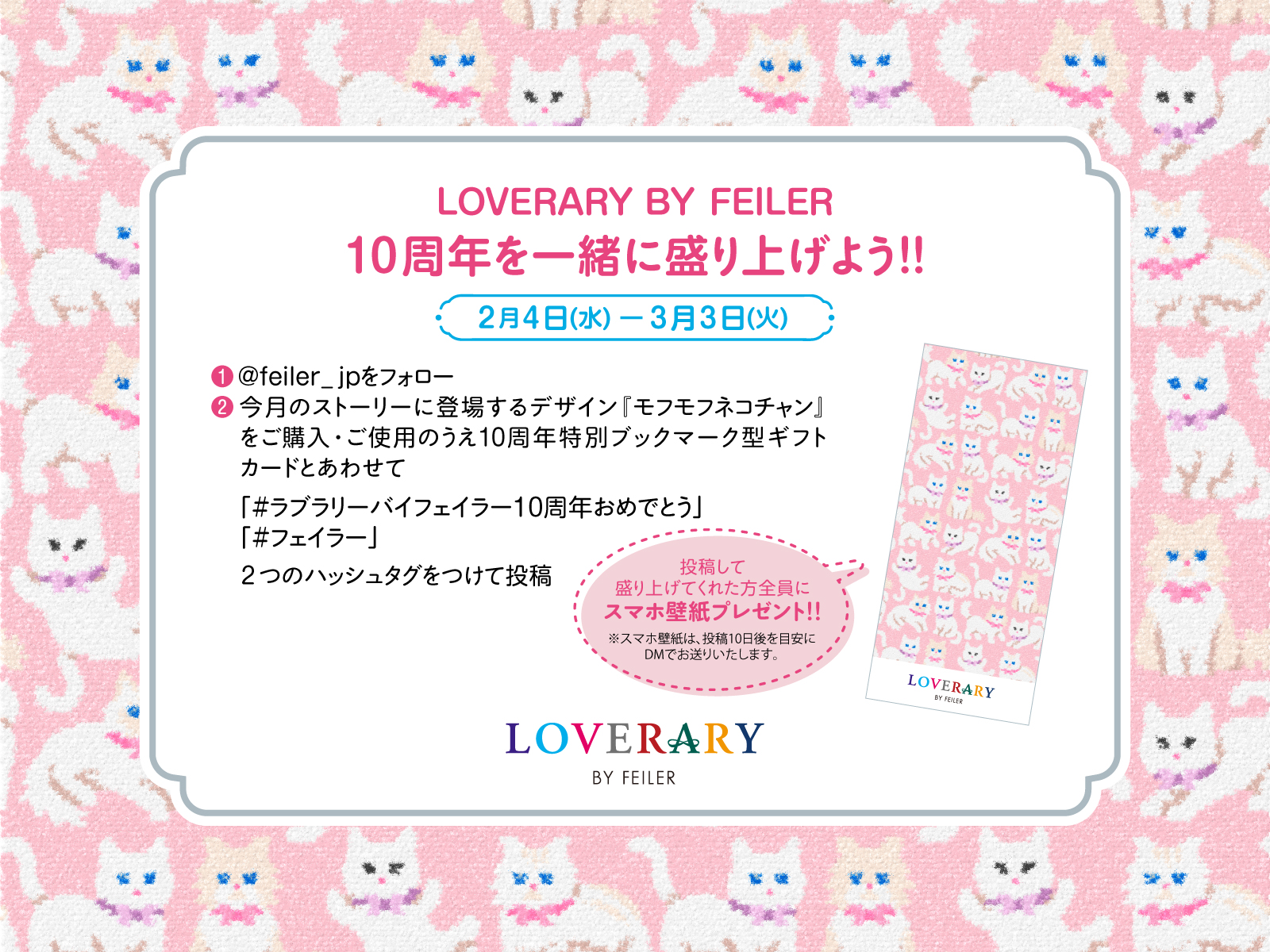 ② ハッシュタグ「 フェイラー 」「 ラブラリーバイフェイラー10周年おめでとう 」の2つのハッシュタグをつけて、ラブラリー バイ フェイラー10周年特別企画 「10th Anniversary 10 Stories」のお買い上げノベルティである1月のブックマーク型ギフトカードと『モフモフネコチャン』の商品を一緒に撮影した写真をInstagramまたはXで投稿