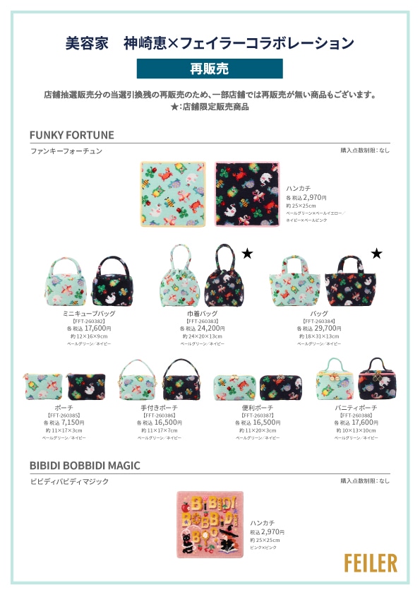 2025年12月に店舗・WEB一括抽選にて販売をいたしました「美容家 神崎恵さん×フェイラー コラボレーション商品」ですが、店舗での当選商品の引換残が発生いたしましため、以下の店舗にて、4月3日(金)より再販売をいたします。